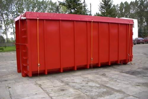 De l'autre côté, la bâche est équipée d’une règle en aluminium avec manivelle. Cette règle est insérée dans la bâche pour faciliter l’enroulement de celle-ci. Des sangles qui sont attachées à la règle permettent de tendre la bâche sur le conteneur.